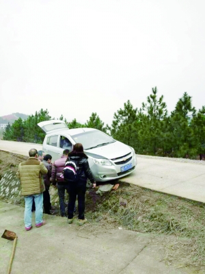下午两点许,我们从李桂成家返回衡阳,行至龙溪桥水库大坝杜唐村地段时,迎面驶来一辆汽车,我车司机避让过度,右边两个车轮滑到公路边的泥面上了,动弹不得。