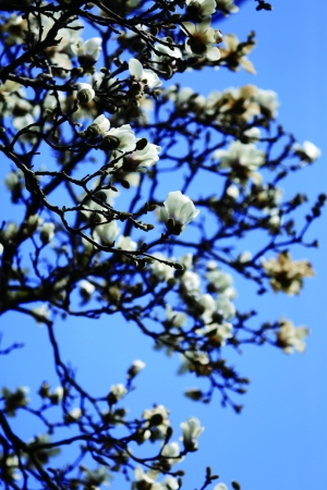 西湖公园的白玉兰在蓝天下显得灿烂夺目。