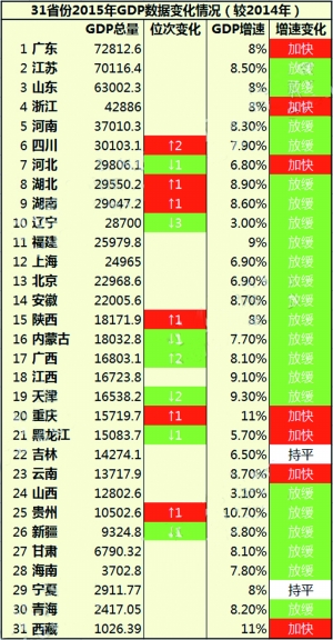 2015年,河北、辽宁、内蒙古、广西、天津、黑龙江、新疆等7地GDP总量排序出现下滑。