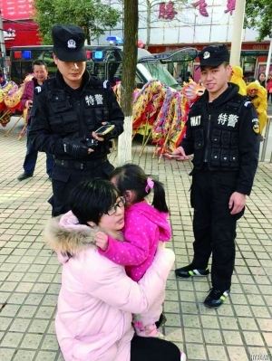 2月20日,衡阳县市民唐女士的女儿走失,衡阳县公安局巡特警大队特警队员帮忙在明翰广场找到。图为母女团聚时的感人场景。 唐兴国 摄
