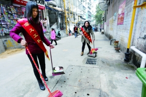 几名志愿者正在义务清扫地面。