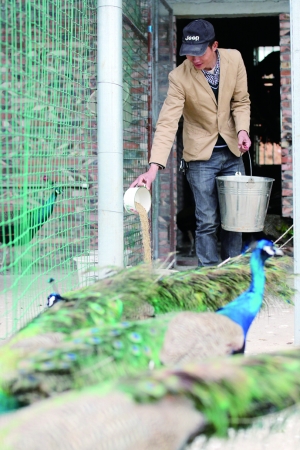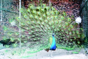 在记者游览成海兵创办的“孔雀王国”时,几只雄孔雀热情地展开了彩屏,色彩斑斓的羽翎让人看得目眩神迷。成海兵介绍,每年8月,孔雀就开始换毛,10月底再长出新尾,3月前后,羽毛焕然一新,是孔雀最漂亮的时候。