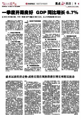 一季度开局良好 GDP同比增长6.7%