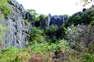 “城”周崖壁,造型更为奇特多变。北面如石墙竖立,比较平整。东南两侧峰林密布,沟壑万千。“城”基密生藤罗草木,有的泛黄入秋,有的绿意如春。