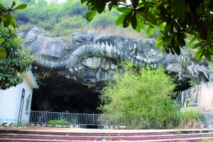 西面山脚下,是青龙洞的入口。一条人造巨龙,飞舞在洞眉上。敞开的岩厅,可容百十号人。石体灰白,像水泥的颜色,钟乳亦无特色。据资料介绍,青龙洞当地称黑岩,全长八百多米,空间巨大,达三万多平方米。造型千奇百怪,楼上楼、洞中洞一应俱全,人物鸟兽惟妙惟肖。因洞内黑暗,我未带光源,无法深入。