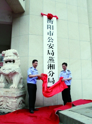 6月2日上午,市公安局蒸湘分局举行新装门头竣工揭牌仪式。蒸湘区副区长、分局局长吴小平,分局政委谭璇共同为分局门头揭牌。吴小平表示:新面貌要有新思维、大投入要有大作为、好形象要有好氛围,要通过从严管理,打造优良警营生态,在精神上要有新气象,在管理上要有新标准,力争将蒸湘公安队伍打造成软硬件“双一流”的优秀警队。苏敏 摄