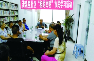 及时动员部署。自今年4月以来,清泉里社区组织辖区楼栋长认真学习了市、区两级“相约文明”市民学习实施方案,并结合社区实情,制定并向辖区居民发放了《清泉里社区“相约文明”居民学习实施方案》,同时召开专门会议进行研究和部署。