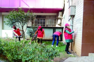 温家台社区志愿者在帮助居民清理房前屋后的垃圾及“牛皮癣”