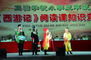 最近,耒阳正源学校小学三年级举行了主题为“弘扬国学,品读西游”《西游记》阅读课知识竞赛。整场比赛在《大王叫我来巡山》的舞蹈热身中徐徐开启。比赛有必答题、抢答题、朗读题、风险题、才艺展示题。经过评委老师公开、公平的评判,八戒队获得冠军,唐僧队获得亚军,沙僧队和悟空队获得季军。