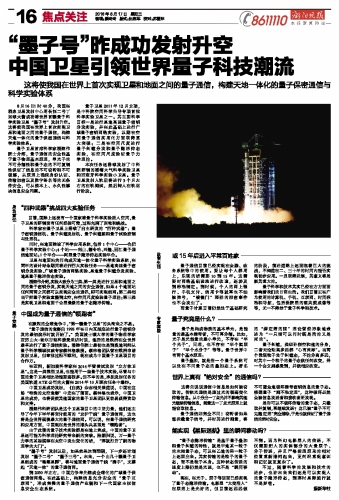 “墨子号”昨成功发射升空 中国卫星引领世界量子科技潮流
