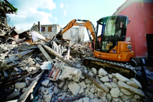 在意大利阿马特里切,挖掘机在废墟上进行营救工作。