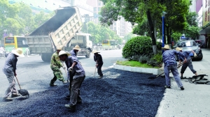 船山中路晶珠广场至市人口路口道路改造施工项目部经理陈衡军介绍说,“每一条路段必须经过压路机7—8次来回碾压,施工人员需要不停地走动观察。” 陈衡军告诉记者,晶珠广场至市人口路口1.5公里长的道路改造沥青摊铺共耗时5天,摊铺沥青三层,厚度达16公分,较之先前加厚了7公分,增厚密实了许多;1.5公里长的路面共摊铺沥青达1万4千吨左右;为了给施工人员降温消暑,施工期间不断供应豆沙、饮用水及人丹、藿香正气水等防暑药物。