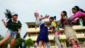据腾讯网报道 今年24岁的梁海换和23岁的吴忠艳是广西融水县城人,她们2005年大学毕业后,主动申请回到县里的大年乡高马村小学担任特岗老师。高马村小学是全县最边远的村小之一,学生大多是留守儿童。梁海换和吴忠艳利用学校现有场地,创办了“留守儿童之家”,设有各种兴趣班,以及小小针线角、小小医疗站等服务项目。高马村小学的其他老师也逐渐加入其中,为孩子们做一些力所能及的服务工作。梁海换和吴忠艳这对“姐妹花”的付出得到了社会的认可,她们双双获得2016年第二季度广西柳州市“最美柳州人”的称号。图为9月6日,吴忠艳(左一)、梁海换(左二)和孩子们做游戏。 微 议