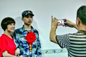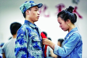 一位姐姐为弟弟戴上“光荣入伍”大红花