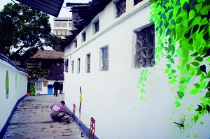 老巷住户偏爱宠物狗,不少人家都有小狗小猫,孩子们也多是伴着宠物一路嬉戏成长。于是,花猫、小狗也自然而然成了墙绘中的“明星”角色。“其中,有一只棕色的墙绘小狗是以住户家的宠物狗为原型画的,谁知太逼真,它的原型弟兄见了竟吃醋般跑出去冲着墙狂吠。”墙绘设计者王亚丽笑着说。