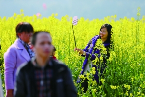 油菜花田中,游客开心自拍。