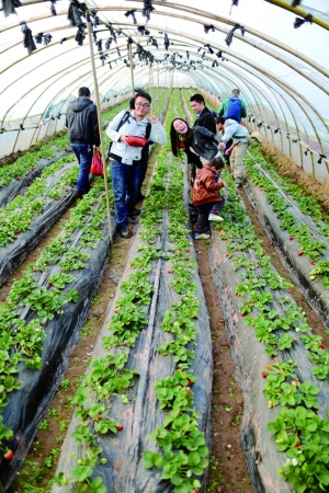 市民结伴到城郊大棚摘草莓
