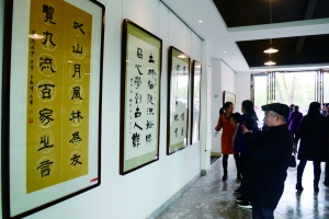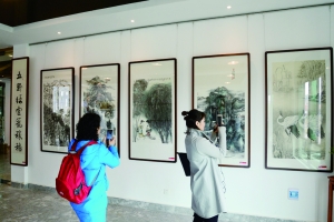 游客欣赏书画作品