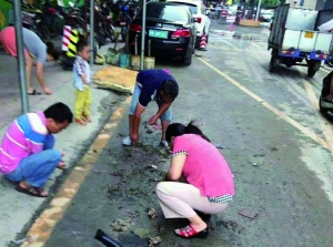 回放:5月7日,广州普降特大暴雨。当天下午,位于番禺区大罗塘珠宝产业区集聚区,多家珠宝店及珠宝批发市场受浸,大水冲入珠宝店内,造成部分珠宝原料被冲走,从7日到8日,不断有闻讯赶来的市民,在水浸过后留下的淤泥和垃圾堆中“寻宝”。据珠宝店老板黄先生介绍,最开始是叫员工去寻找被冲走的珠宝原材料。不过,路过的市民、附近的打工者见状,都加入到寻宝挖金的行列。但事实上并没挖到什么值钱的东西。