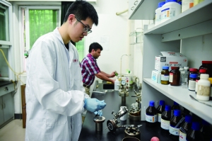 少年班的大四学生陈楚白(左)在实验室内做实验。