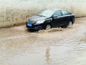 19日下午,在衡祁路与西外环路交汇口、市电大围墙旁,记者发现一条长约20米,宽6米的积水带,车辆经过,摇晃震动,溅起阵阵水浪,过往路人无奈只得绕道而行。