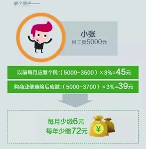 那么,这项政策,到底可以为您省多少钱呢?我们以月薪5000元的小张为例,看看其中的省钱之道吧。假设小张月工资为5000元,以前每月应缴个税为:(5000-3500)×3%=45元,购商业健康险后应缴:(5000-3700)×3%=39元,每月少缴6元,每年少缴72元。