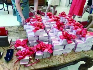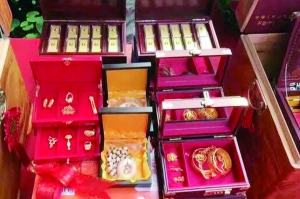 回放:近日,在浙江宁波出现了一场十分土豪的婚礼,有网友在现场发帖称:“真霸气!聘礼都花了500多万,你们服不服?”528万现金,大家可以想象一下有多少,图中这些红色包装的全是百元大钞,后面的两个行李箱就是用来放钱。除了528万的现金,还有各种名贵的金器,这排场不得了,一场婚礼下来花销怎么也是几千万了吧?