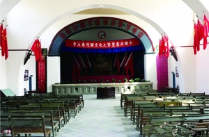 1941年,杨家岭中央大礼堂开始修建,1942年完工。整个礼堂建筑朴素大方,体现了中西合璧的设计风格——外观是仿苏联式,内部是陕北窑洞式的石拱结构。礼堂可以容纳上千人。修建这么一座礼堂,今天来说可能算不上什么,但在当时的延安,可称得上“宏伟建筑”了。这也是当年延安唯一的有木梁和木柱的大型建筑物。因为前六次党代会都是在别人修建好的房子里召开的,所以朱德风趣地说,这是我们党第一次在自己修建的房子里召开党代会。
