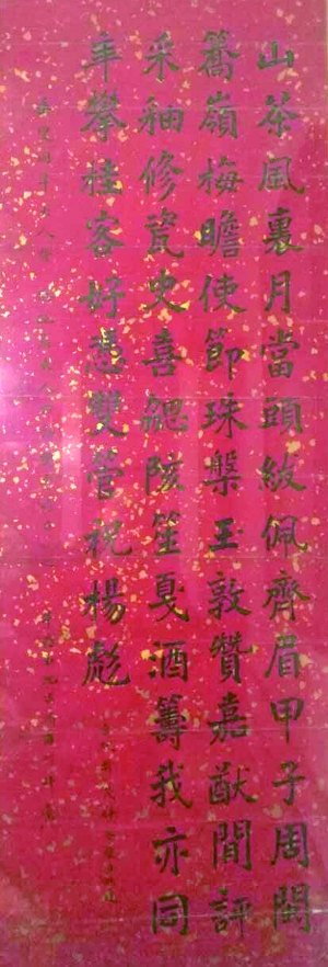 这件书法作品是小四尺是为一个垂叟周大人和他夫人六十大寿所写的,里面的诗词正是沈宗畸所作,内容是:山茶风里月当头,绂佩齐眉甲子周。闽簥岭梅瞻使节,珠盘玉敦赞嘉猷。闲评采釉修资史,喜协陔笙戛酒筹。我亦同年攀桂客,好凭双管祝杨彪。年愚弟沈宗畸孝耕拜祝。难得的是这幅字旁边还有与他同时中举的人写的一行小字:沈宗畸,字孝耕,广东番禹人。古人过生日,送幅书法作首诗,雅致之极。哪像现在,吃饭喝酒送礼金,倒是显得俗气多了。