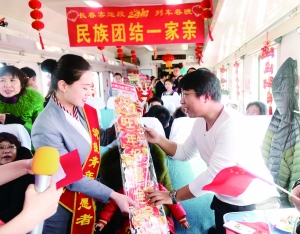 2月14日,列车乘务员为旅客送春联。当日是农历腊月二十九,中国铁路沈阳局集团有限公司长春客运段工作人员联合长春希望高中、长春市朝鲜族中学的学生,在长春至乌鲁木齐T302次列车上举办“民族团结一家亲 福满车厢欢乐年”列车春晚。用歌声和舞蹈为旅客送去新春的祝福。■新华社发