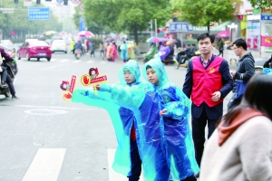 来自市产权处的志愿者,冒着霏霏细雨开展主题劝导活动。 唐 君 摄