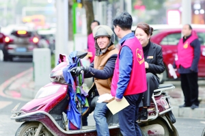 志愿者正在劝阻逆行电动车主