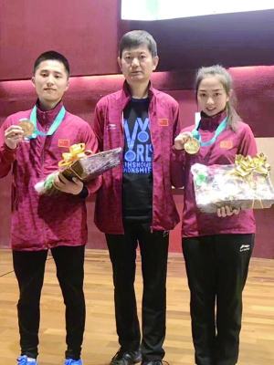 陈克多(左一)和慈溪运动员徐红获得冠军后合影