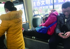 近日,岳屏公园东门附近。在一辆145路公交车上,一名女乘客抱着小女孩,将双腿搁在座位上,靠在男乘客臂膀上昏昏欲睡。这样的坐姿实在不雅,真把公交车座椅当作自家的沙发了。