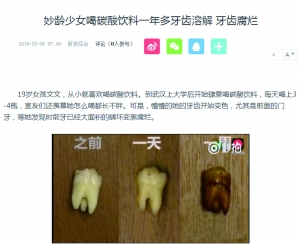 消息显示,女孩每天喝3-4瓶碳酸饮料,将一口洁白漂亮的牙齿喝到变黑腐烂,被医生诊断为酸蚀症。这可吓坏了爱喝碳酸饮料的朋友,来,我们一探究竟!