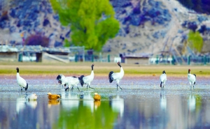 3.黑颈鹤。大型涉禽,体羽灰白色,头部、前颈及飞羽黑色。繁殖于中国西藏、青海、甘肃和四川北部一带,越冬于西藏南部、贵州、云南等地。