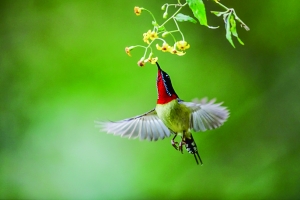 1.叉尾太阳鸟。别称燕尾太阳鸟,嘴细长下弯,舌呈管状,专门用来吮吸花蜜,因此又被称为“亚洲蜂鸟” 。常见分布于中国南方以及越南。