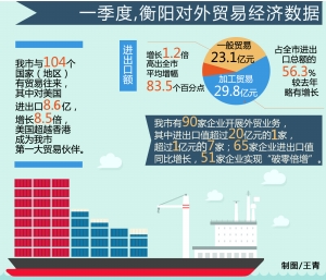 一季度,衡阳市有90家企业开展外贸业务,其中进出口值超过20亿元的1家,超过1亿元的7家;65家企业进出口值同比增长,51家企业实现“破零倍增”。