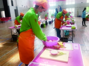 家政服务员选手进行水果拼盘制作比赛