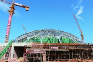 本报讯 5月14日,记者在衡山县体育馆施工现场看到,经过半年的紧张推进,该县体育馆主场馆主体工程、钢结构吊装全部完成,正在进行主场馆金属屋面和玻璃幕墙的安装施工,整个主馆仿佛一朵徐徐盛开的莲花。据悉,下一步施工单位将倒排工期,日夜施工,确保如期完成,为省运会创造良好的比赛环境。