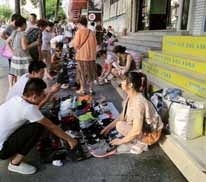 14日下午,在蒸阳南路与雁城路交会口,记者看见各式各样的地摊摆设在人行道上,以鞋摊为主,粗略计数共有7处,挤占了一大半人行道。“这双皮鞋还有七成新,35元一双,不再讲价了。”一位摊主粗声大气地同一位试鞋的顾客说。记者观察发现,地摊上的皮鞋大多为二手鞋。据附近居民介绍,这些鞋摊在此摆放已达5年之久。每天傍晚6时一直摆至8时许,才缓缓散去。