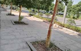 19日下午,记者来到衡州大道与光辉街交会处,看到100来米长的街面两旁的行道树清一色全部被缠上金色的绸布,布上钉满了铁钉,铁钉早已锈蚀。记者粗约计数,被人为穿上“黄金甲”的行道树以香樟居多,共计90余棵;一些行道树上还垂悬着灯管、电线及插头。“去年,一楼盘销售中心为了烘托营销气氛,招徕顾客上门,特地给树木缠上金色的绸布和亮化灯管。”家住衡州大道附近的朱先生告诉记者,这些低垂的电线、灯管一旦通电,可能会危及路人的人身安全,商家不应为造气氛而伤害行道树。