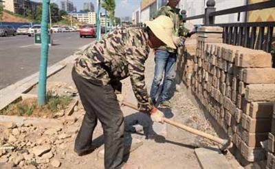下午4时许,在万达路南侧的人行道上,工作人员正顶着烈日破除破损的透水砖,一会工夫在人行道上刨出一条几十米长的槽沟。现场施工负责人刘勇明介绍,此次维修范围包括人行道南侧110米、北侧60米破损的路面,将原有的透水砖全部刨除,铺设一层C25混凝土,相比之前的C20混凝土抗压强度更大,然后在混凝土上铺装新的透水砖。