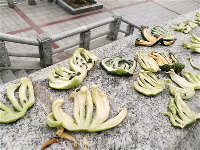 本报讯 “腐烂的瓜果,摆放在风光带护栏上晾晒,熏得人根本受不了!”近日,有市民致电本报热线8611110反映,有些水果摊贩将腐烂的瓜果放在风光带上晾晒,影响环境卫生,有损城市形象。