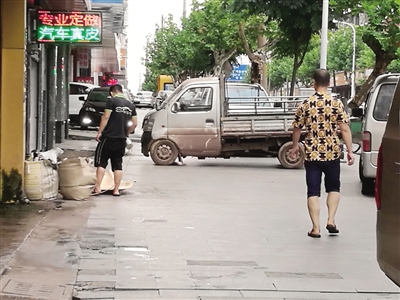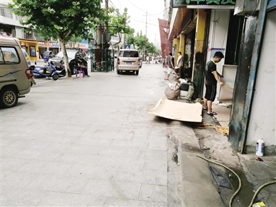 3日下午,在雁城路75号附近地段,记者看见一汽车内饰改装店铺门前摆放着一块汽车外壳配件,一名身穿黑衣的青年男子操持喷水壶往配件上喷水,水珠四溅,过往路人纷纷绕道而行。记者观察发现,这家店铺门外还堆放着两个皮革袋,袋内盛装碎皮条等物品。雁城路居民陈大伯告诉记者,除了汽车内饰改装店家占道经营作业之外,沿路还集中分布着洗车店、车辆维修店等店家,一些店家将人行道当成了私家作业场,占道作业现象较为突出,弄得油渍满地,污水横流,环境脏乱,严重妨碍了周边居民的正常出行。