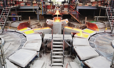 五矿金铜双圆盘浇铸机正在进行阳极铜浇铸