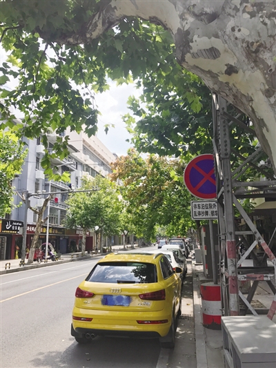 先锋路上,禁停标志和停车位同时出现,但标志下方注明了“停车泊车除外,乱停抄牌、锁车”的字样。