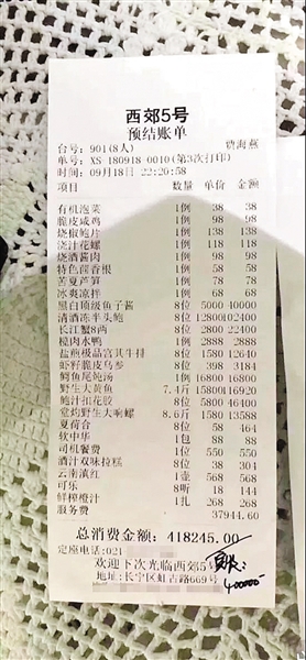 网传“天价账单”(见图)出自上海一家名为“西郊5号”的饭店,出单台号为901,用餐人数为8人,账单显示,结账时间为18日晚10时20分,所点菜品共20项,其中包括有机泡菜、芦笋、凉拌菜等,但绝大部分菜品为螃蟹、花胶、鲍鱼等海珍品,另有包括可乐等在内的饮料,以及香烟。