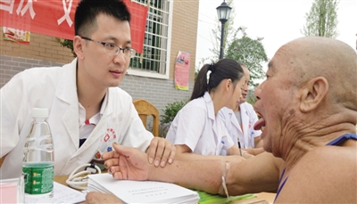 9月30日,祁东县卫计局组织医疗专家来到风石堰镇吕家村开展“签约医生来农家、健康扶贫济众生”活动,县中医医院内科主治医师陈闯(左一)正在为患有脑梗死、高血压、胆囊结石、慢性胃炎病的81岁老人石国民进行义诊。何晓晓 摄