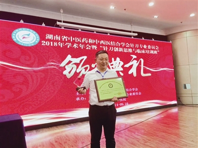 本报讯 近日,湖南省中医药和中西医结合学会针刀专业委员会2018年学术年会暨针刀医学创新思维与临床继续教育培训班在岳阳召开。会议宣布了“优秀针刀专家”“优秀针刀医师”“优秀论文”等奖项的获得者名单,并进行了颁奖,南华大学附属南华医院疼痛科副主任周华茂博士获“湖南省优秀针刀医师”称号,并当选为湖南省中医药和中西医结合学会首届针刀医学创新与科研学组副组长。